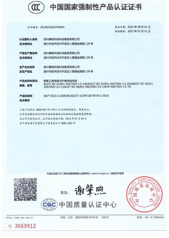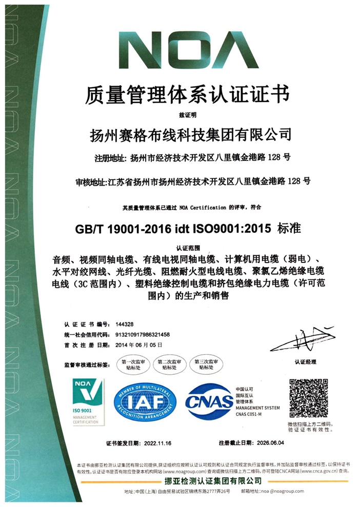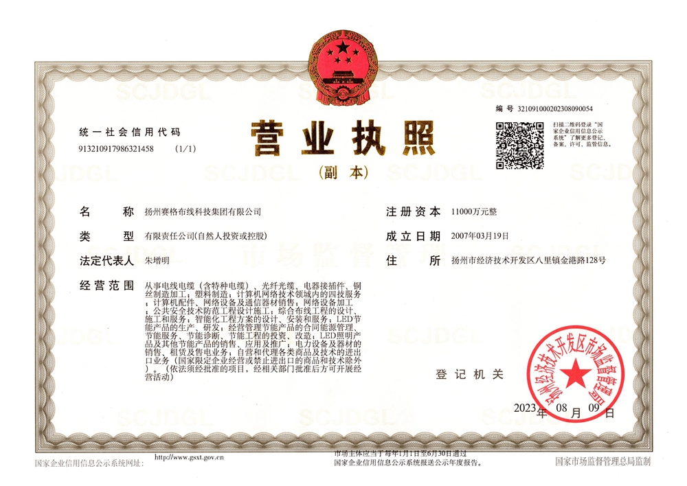 “賽格集團(tuán)”位于美麗的揚(yáng)州,公司占地面積106800平方米,固定資產(chǎn)20000萬(wàn)元,職工近千人,其中各類專業(yè)技術(shù)人員過(guò)百人,系中國(guó)安全防范產(chǎn)品行業(yè)協(xié)會(huì)理事單位。公司擁有各種先進(jìn)的綜合布線產(chǎn)品及線纜制造和實(shí)驗(yàn)檢測(cè)設(shè)備,產(chǎn)品嚴(yán)格按照國(guó)家標(biāo)準(zhǔn)或行業(yè)標(biāo)準(zhǔn)組織生產(chǎn),并已獲得國(guó)家質(zhì)量認(rèn)證中心CQC頒發(fā)的CCC證書和上海挪亞檢測(cè)認(rèn)證集團(tuán)有限公司頒發(fā)的ISO9001:2015證書,泰爾認(rèn)證中心頒發(fā)的“泰爾認(rèn)證”等!