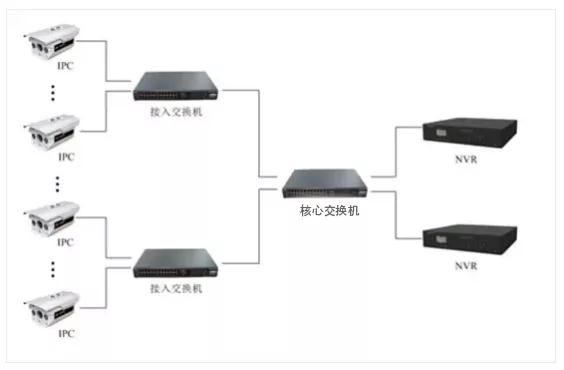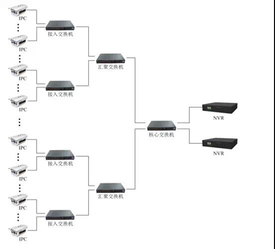 如采用200萬像素IPC,碼流以4Mbps計(jì)算,100臺(tái)攝像機(jī)占用帶寬為4M*100=400M,如果是按照10臺(tái)攝像機(jī)接入百兆交換機(jī)的話,那么我們需要10臺(tái)接入層交換機(jī),那么核心層交換機(jī)需要三層全千兆交換機(jī)。